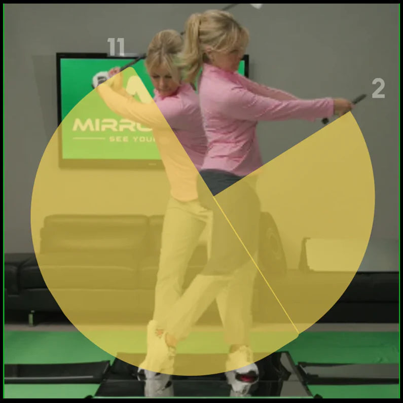 When using both side-wing mirrors a golfer can tell if their shaft is still on plane halfway back. To ensure the proper placement of the mats, the center of the side-wing mirrors should be positioned evenly with a golfers toe line. If the clubhead is not within the view of the side-wing mirror a golfer is out of position. This view shows the entire golf club including the orientation of the clubface be it open, closed, or square.