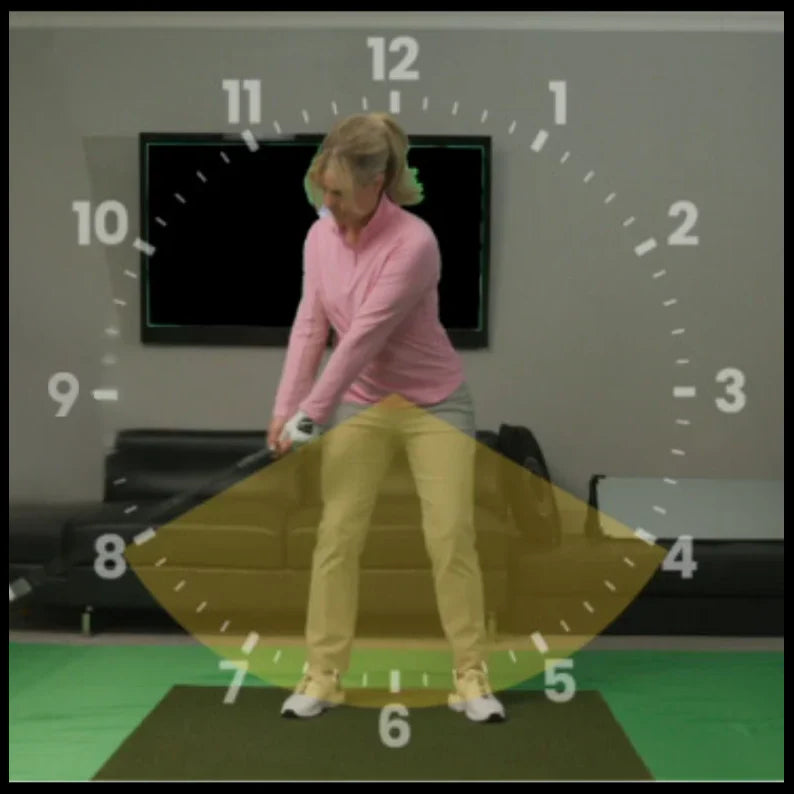 The golfer’s view is limited at the address position and during the swing. A golfer can only see their feet, clubhead, part of the shaft, and golf ball. While the club is moving, a golfer has some peripheral view of the golf club to approximately the 8 o’clock to 4 o’clock positions.